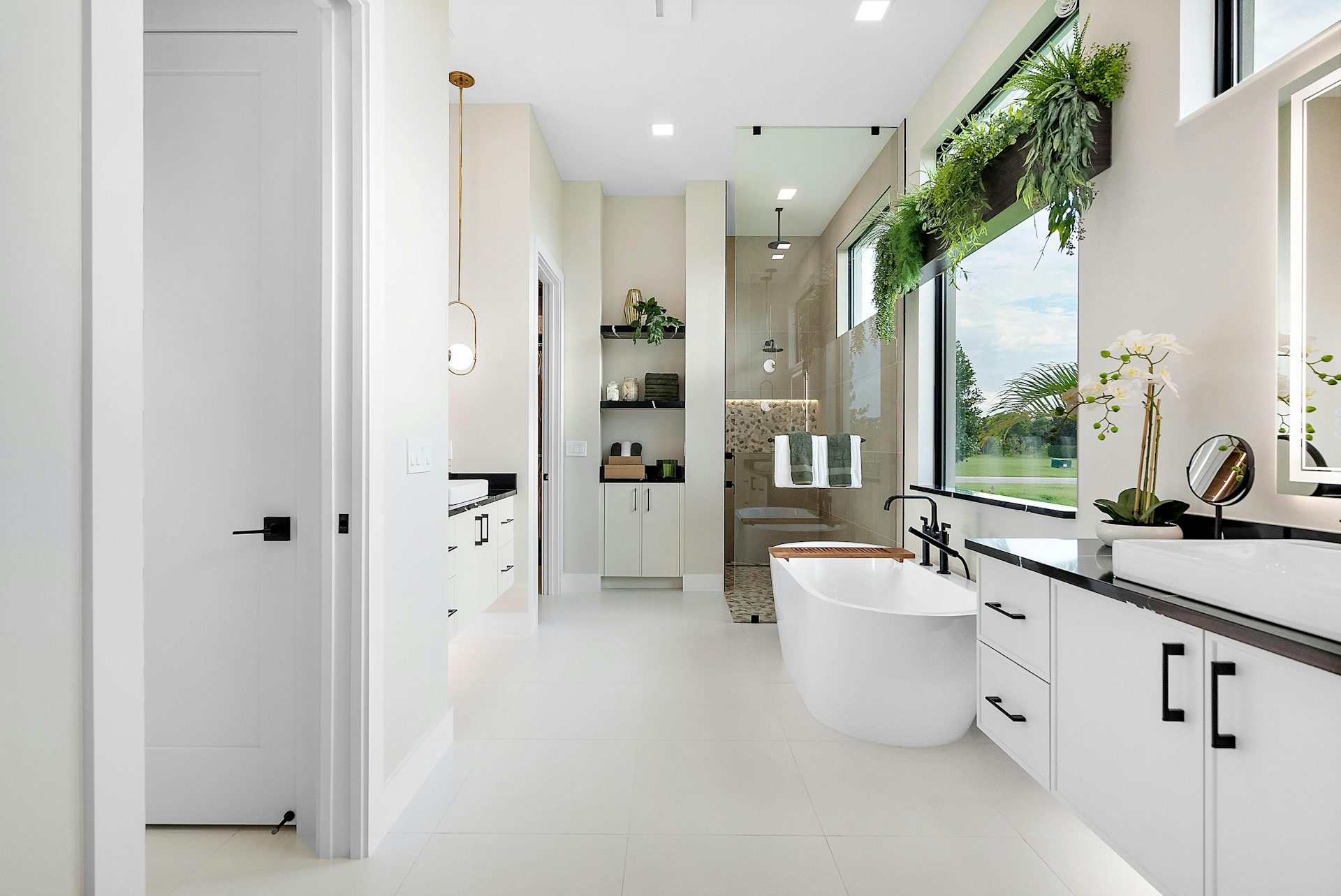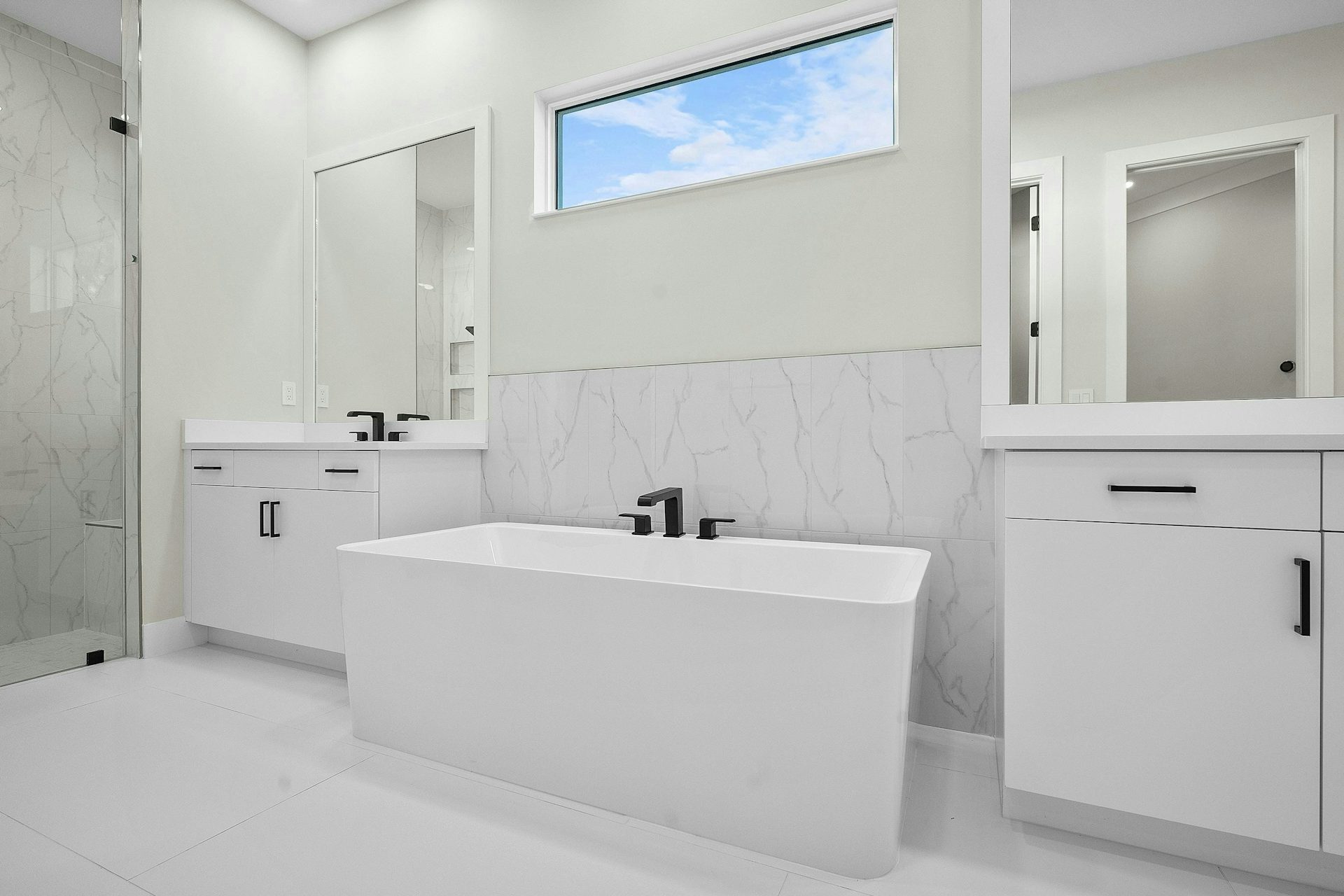 Master bath with modern floating cabinets, soaker tub and talk-in shower