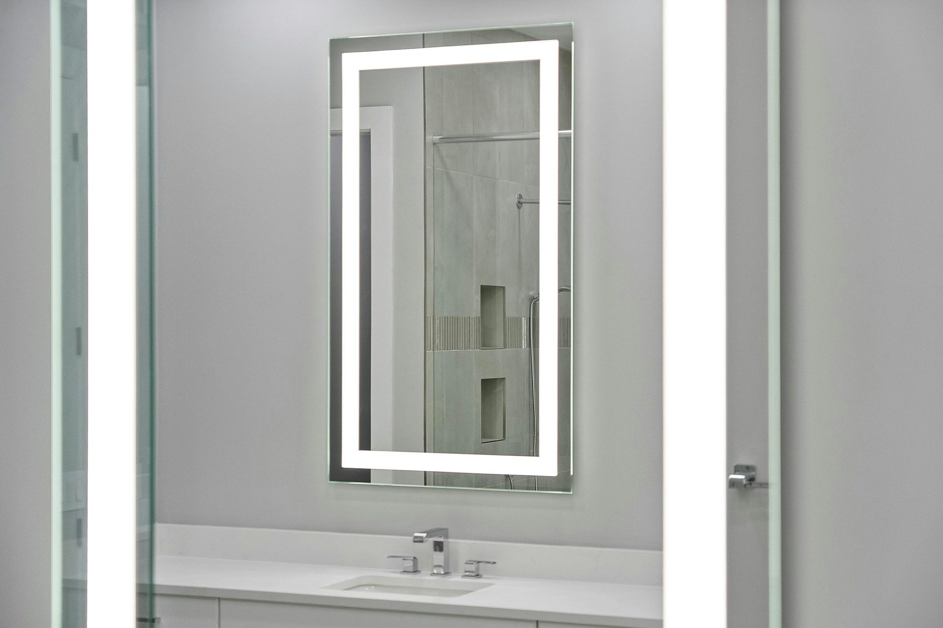 Master Bath in grey tones with dual vanity and LED light mirrors