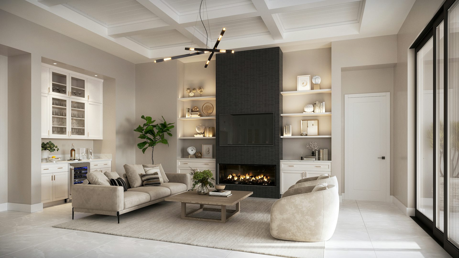 This lakeside home has been thoughtfully designed to embrace the natural beauty of the central lake and its surroundings. The outdoor area is perfect for entertaining, including a pool, a raised spa enhanced by a step stone ledge, a raised pedestal with a water bowl, travertine pavers, a screen enclosure, and an added patio for the gas fire pit area. Inside, the home boasts a gourmet kitchen including stacked cabinets, a gas cooktop, and presents a 42-inch built-in refrigerator. The great room features a cozy gas fireplace with tile surround. Throughout the home, you'll find porcelain tile flooring and wood trim details, including a tongue-and-groove ceiling in the great room, dining room, and foyer, as well as square recessed lighting and linear vents. Currently under construction, this home is slated to be completed early spring 2026! Call for more details.