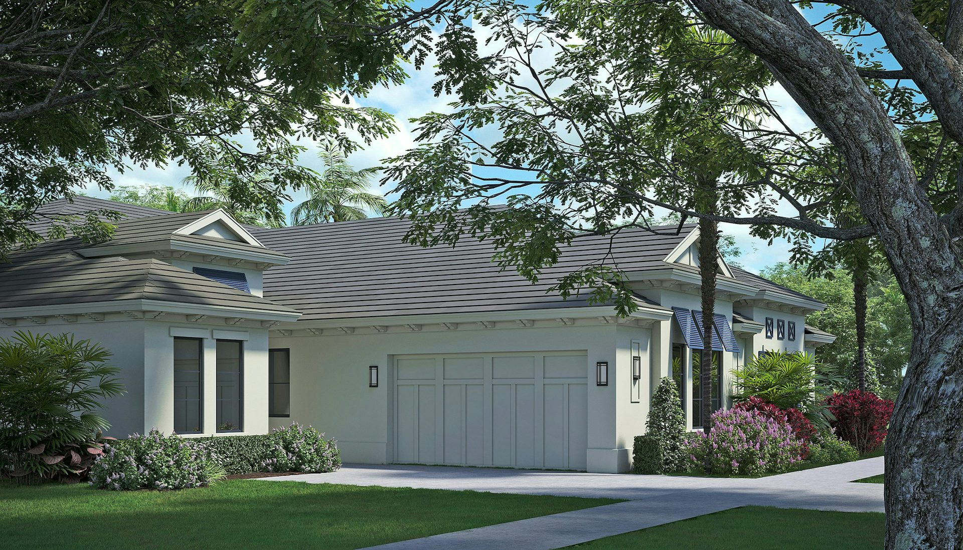 The Seabreeze Grande plan is an attached villa with 3 bedrooms, 3 bath and 2 car garage with high ceilings, expansive windows, allowing natural light to flood the space and create a bright, welcoming atmosphere. The open-concept layout seamlessly connects the kitchen, great room with coffered ceiling and dining area, providing easy access to the patio for effortless indoor and outdoor entertaining.