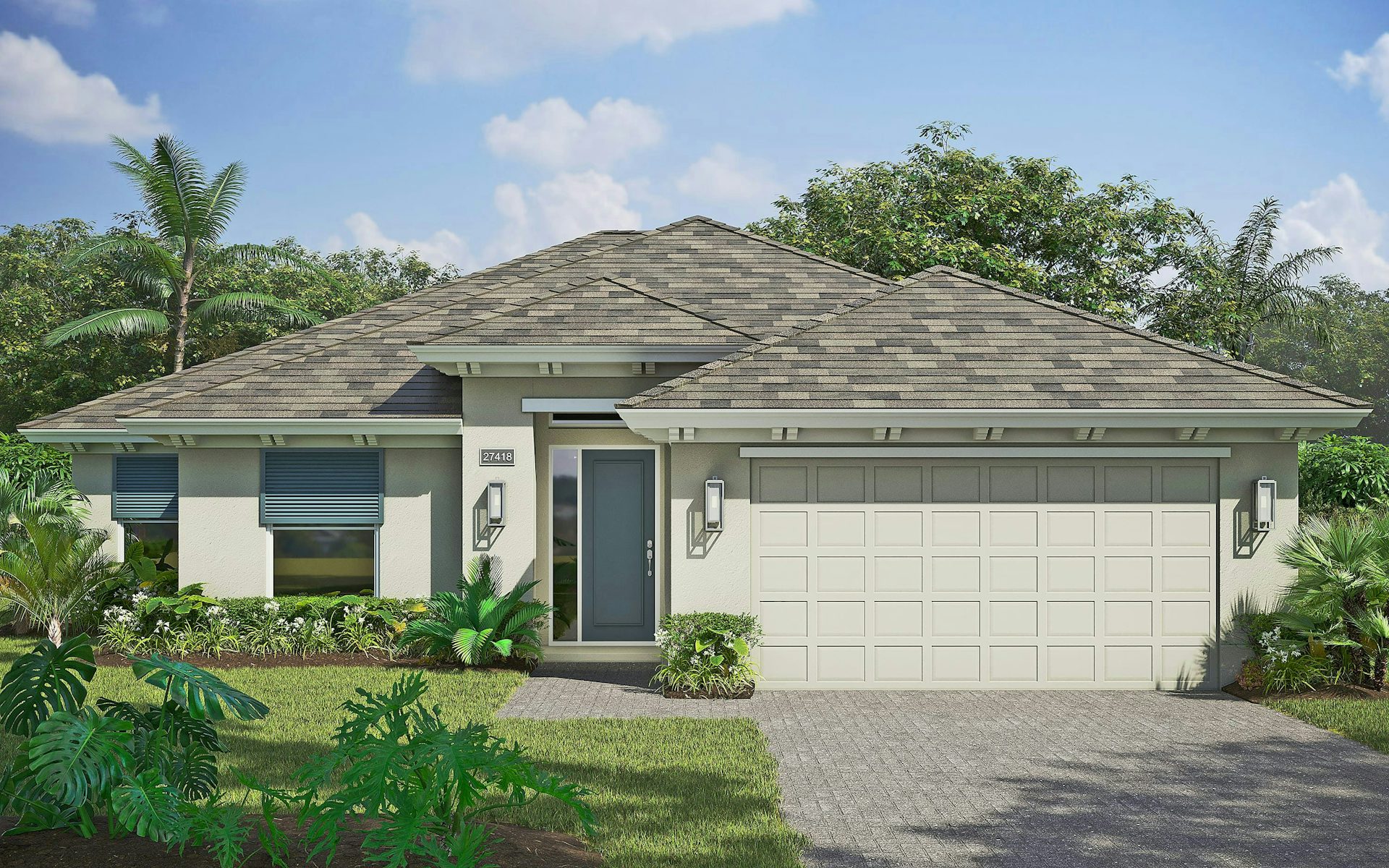 The master suite is designed to provide private sanctuary. It boasts a coffered ceiling, double walk-in closets, split vanities and a frameless glass shower.