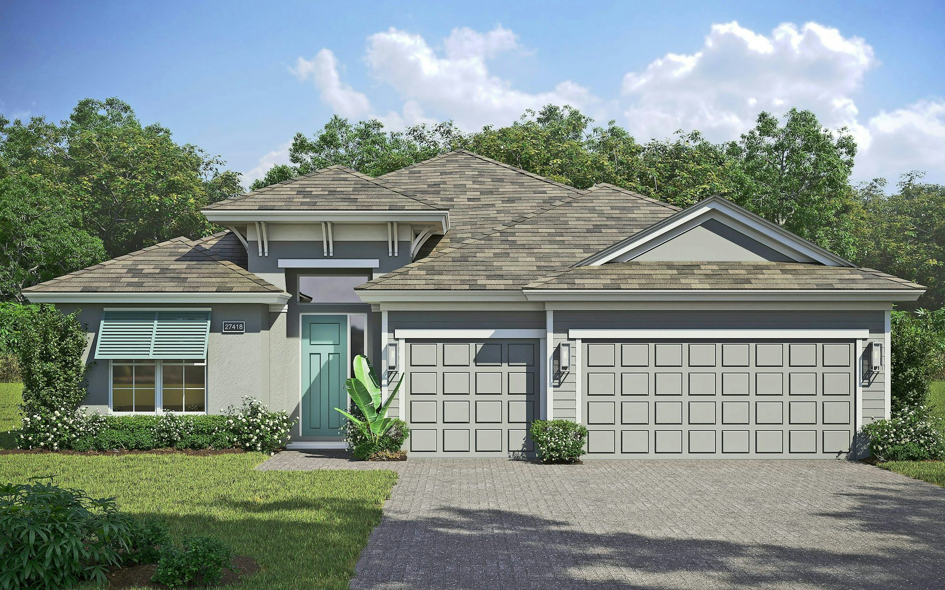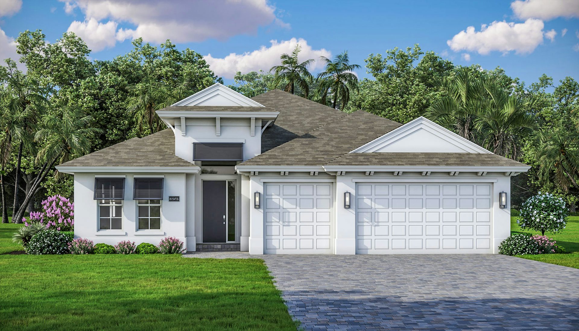 The owner's suite features expansive windows, a spa-like bath with split vanities, glass shower, and double walk-in closets. Additional highlights include 2 bedrooms, one with a private bath, and a versatile den. The 3-car garage provides ample storage space for all your needs.