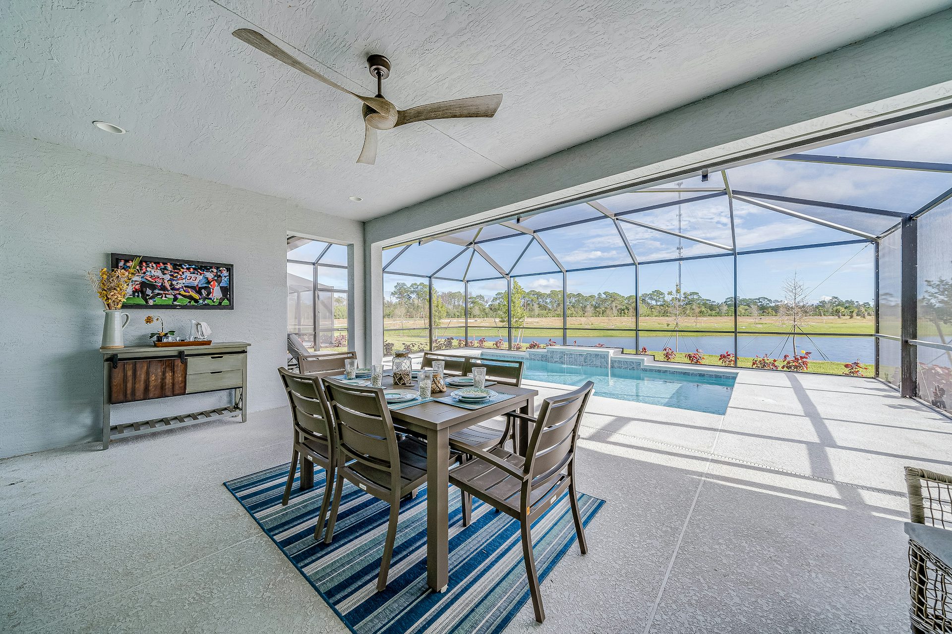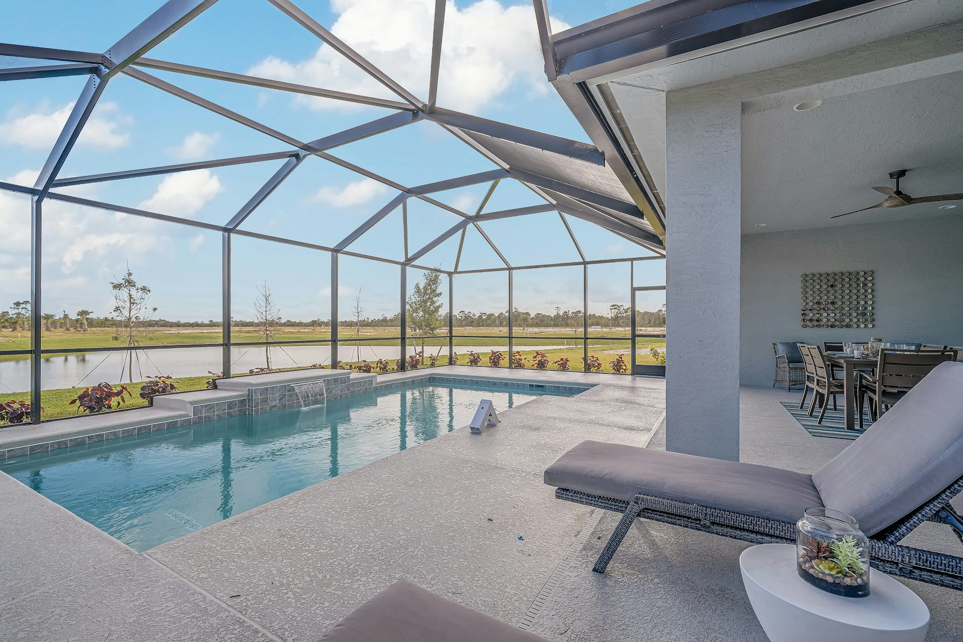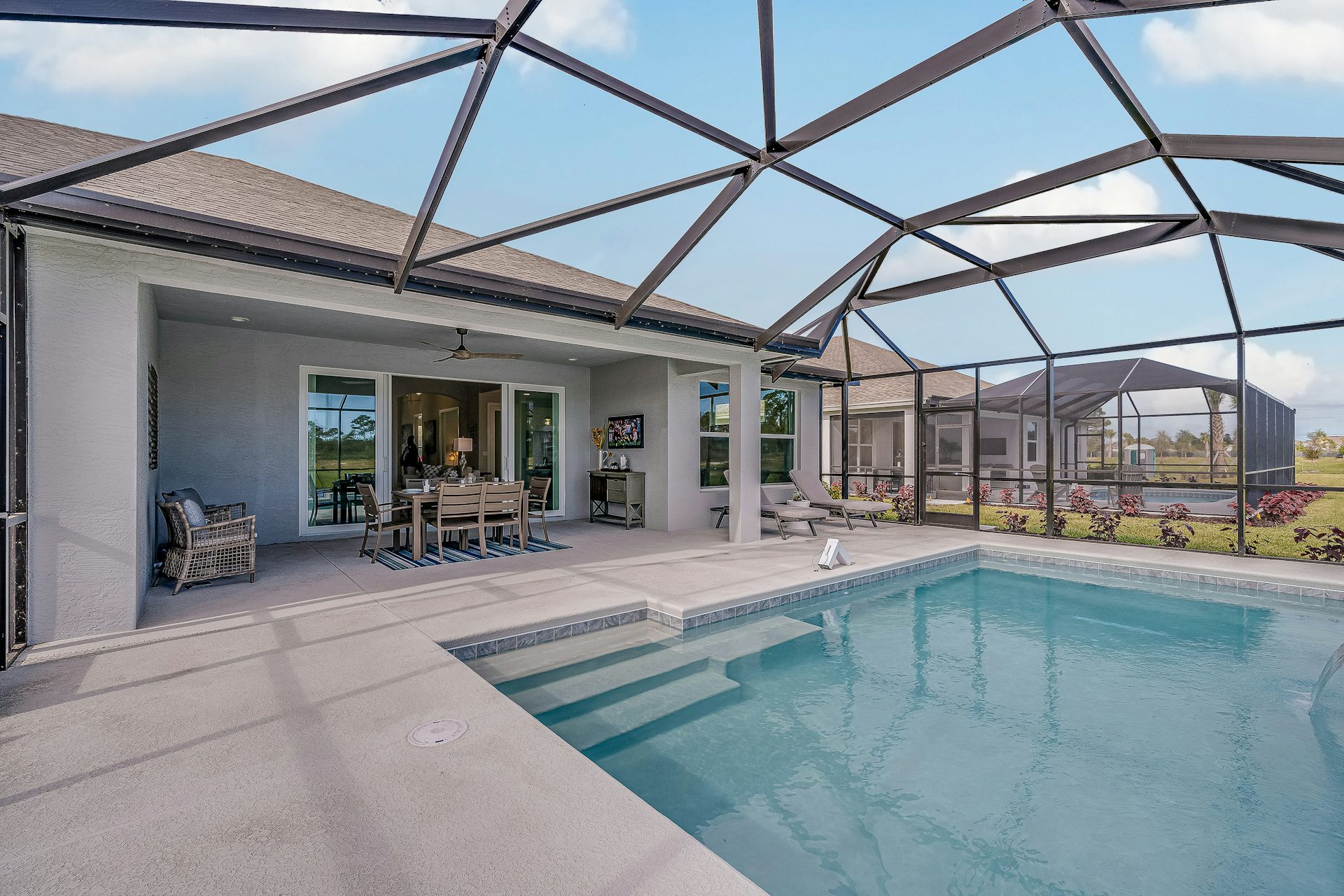 Step into the Capistrano Grande, a best-selling, 3-bedroom, den, 3 bath, 3-car garage floor plan celebrated for its thoughtful design and functionality. As you enter through the foyer, you are welcomed to the great room, kitchen, and dining area, forming the perfect location for both living and entertaining. The kitchen is complete with quartz countertops, lots of cabinets, gas range and stainless-steel appliances and a spacious island. The great room with double slider welcomes in lots of natural light and creates seamless access to the lanai allowing for outdoor entertainment.