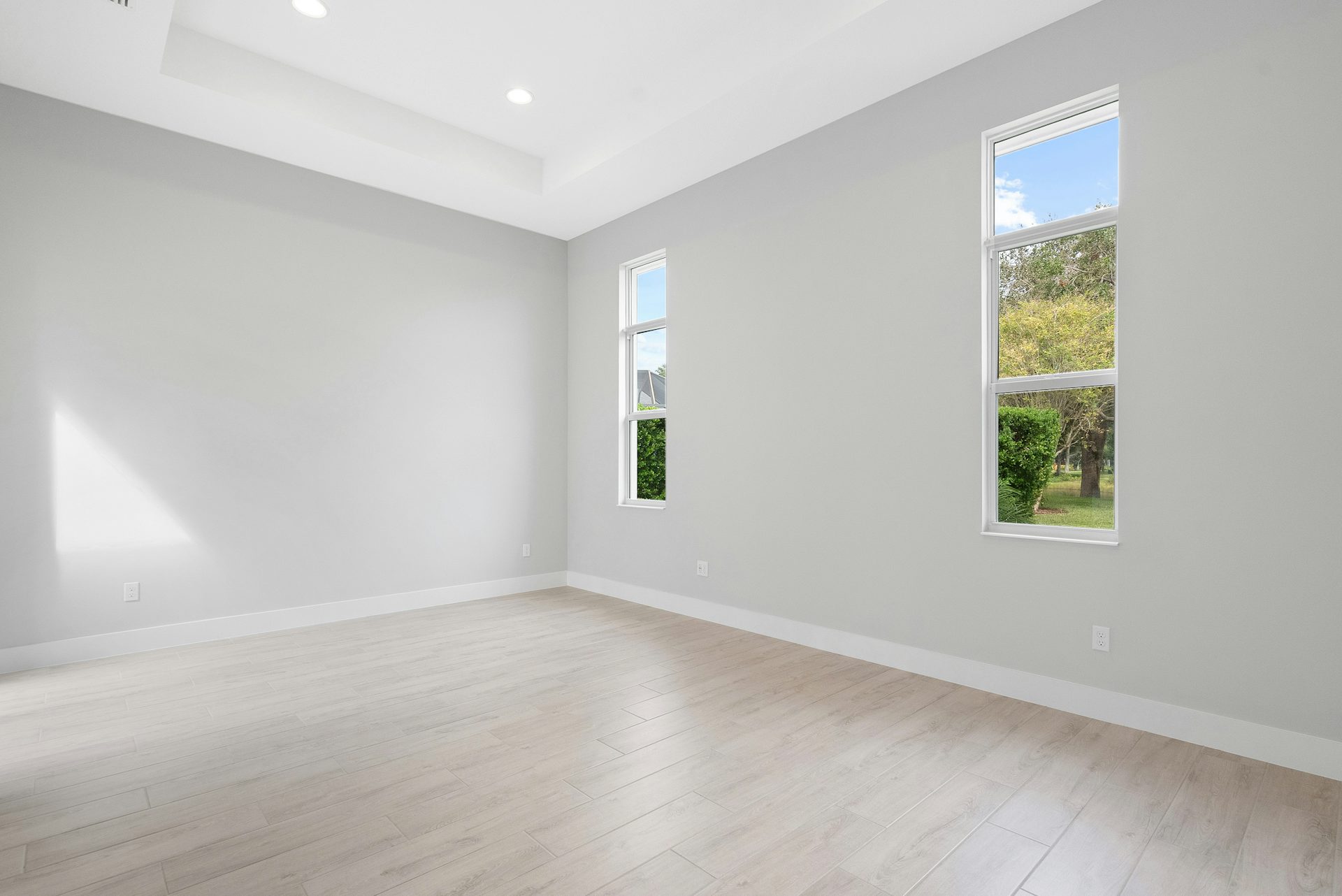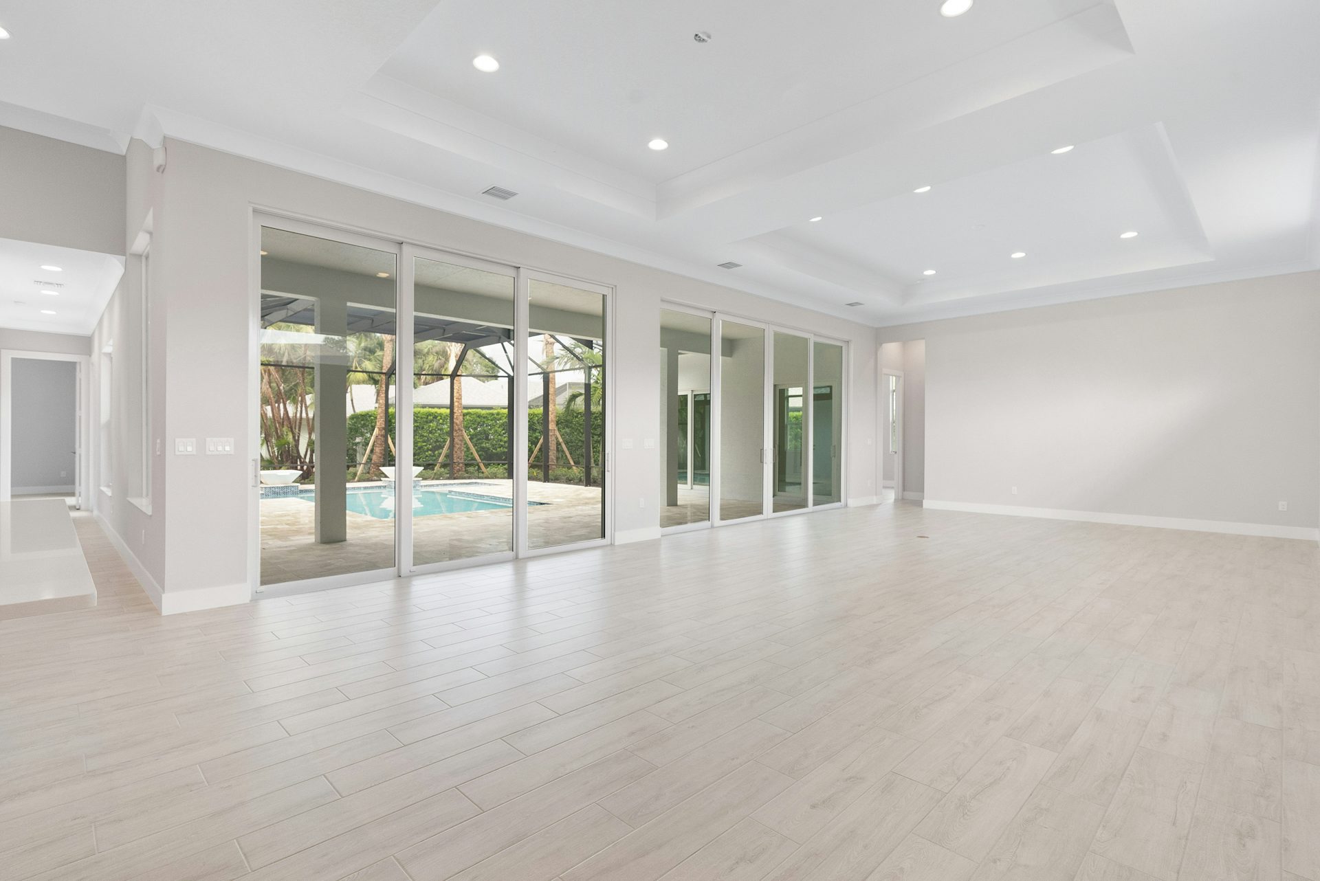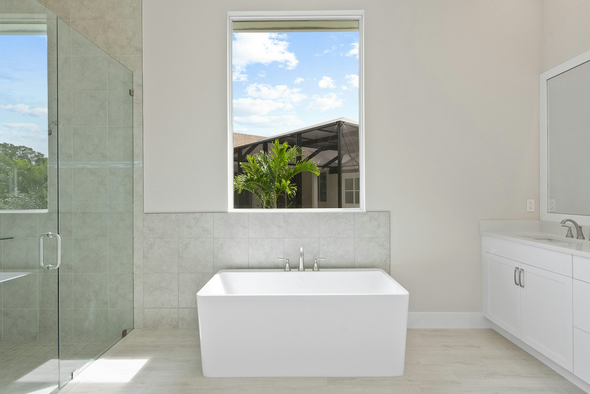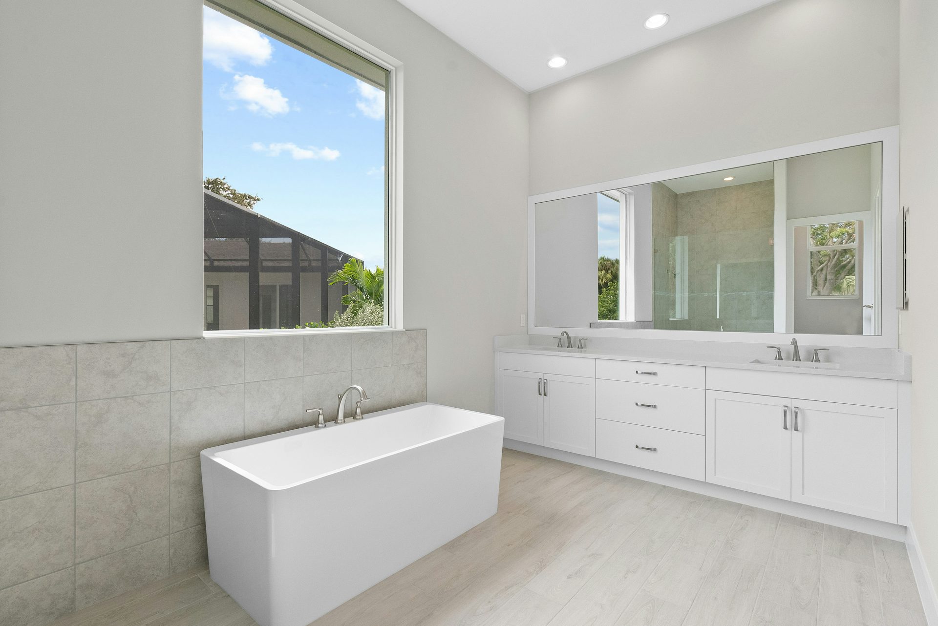 The open-concept dining and great room are highlighted by elegant, coffered ceilings and expansive sliding glass doors that lead to the lanai and pool area, inviting natural light and outdoor living in. At the rear of the home, the master suite is a private retreat with dual sliders, coffered ceiling detail and two generous walk-in closets. The en-suite bath offers a spa-like ambiance with a large soaking tub, walk-in shower and dual vanities.