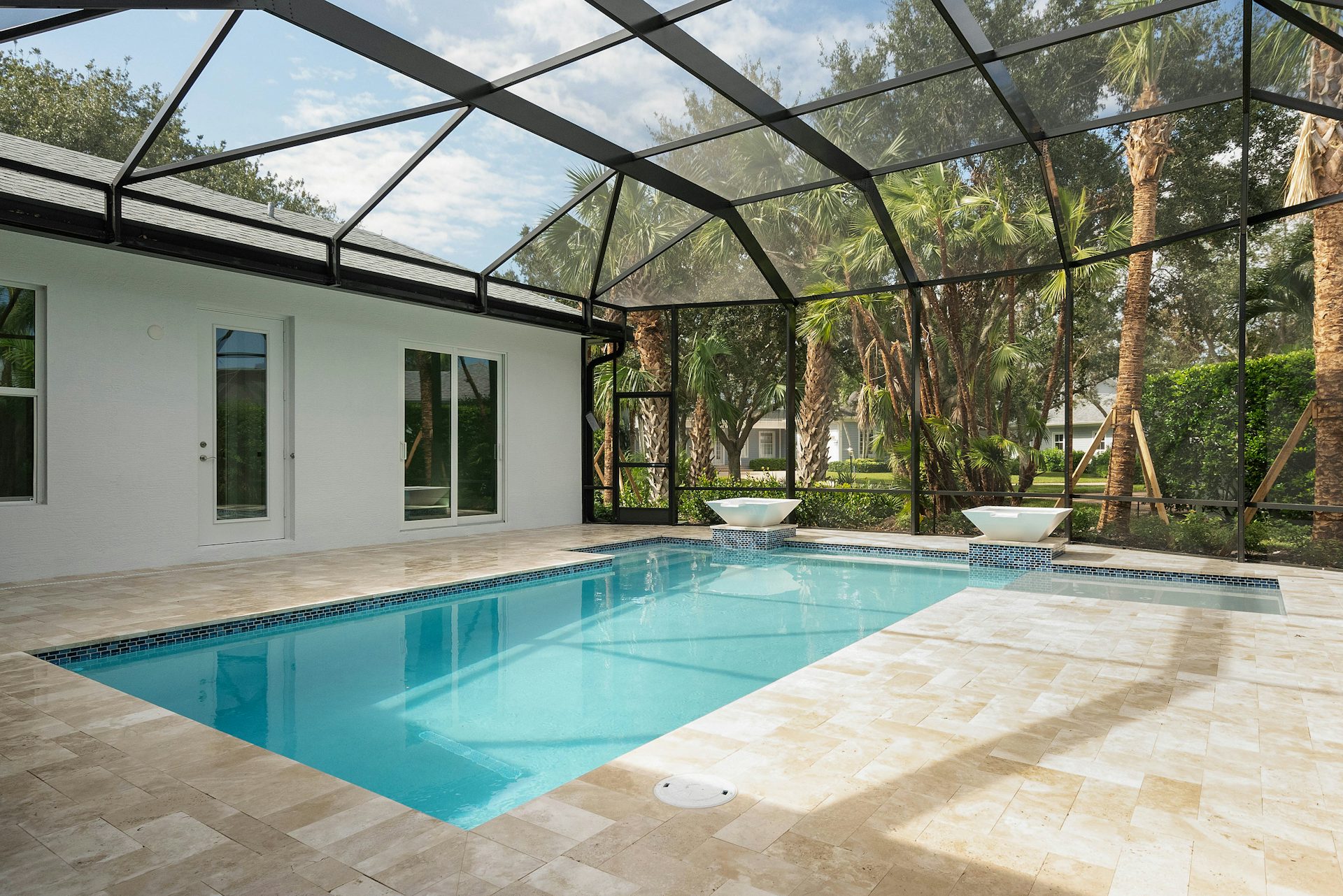 As you step inside, you'll find two guest bedrooms positioned at the front of the home, one of which features sliding glass doors that open directly to the screened pool, creating a seamless indoor-outdoor experience. The gourmet kitchen is equipped with sleek stainless-steel appliances, a built-in cooktop and a wall-mounted oven/microwave combination, perfect for both everyday meals and entertaining.