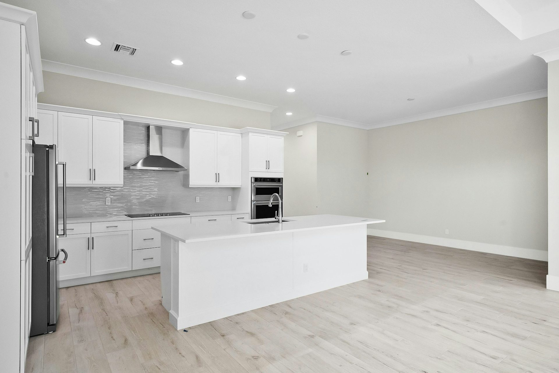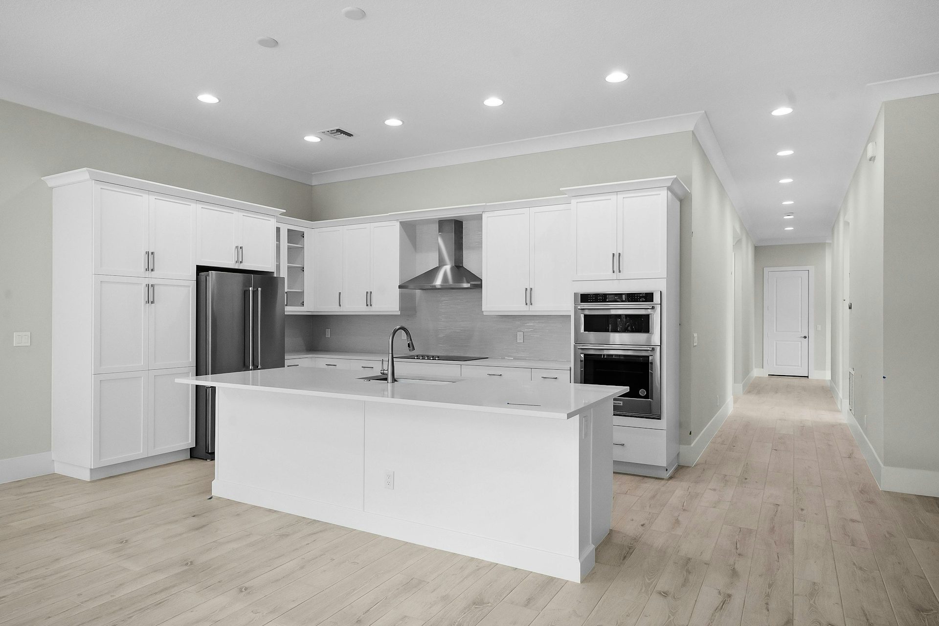 The gourmet kitchen is equipped with stainless steel appliances, quartz countertops, and plenty of storage. Located past the kitchen is the great room with a coffered ceiling and lots of natural light from the windows and slider, which opens to the lanai. The master suite, located at the rear of the home, includes a walk-in closet and a beautifully appointed en-suite bathroom with dual vanities and a walk-in shower.