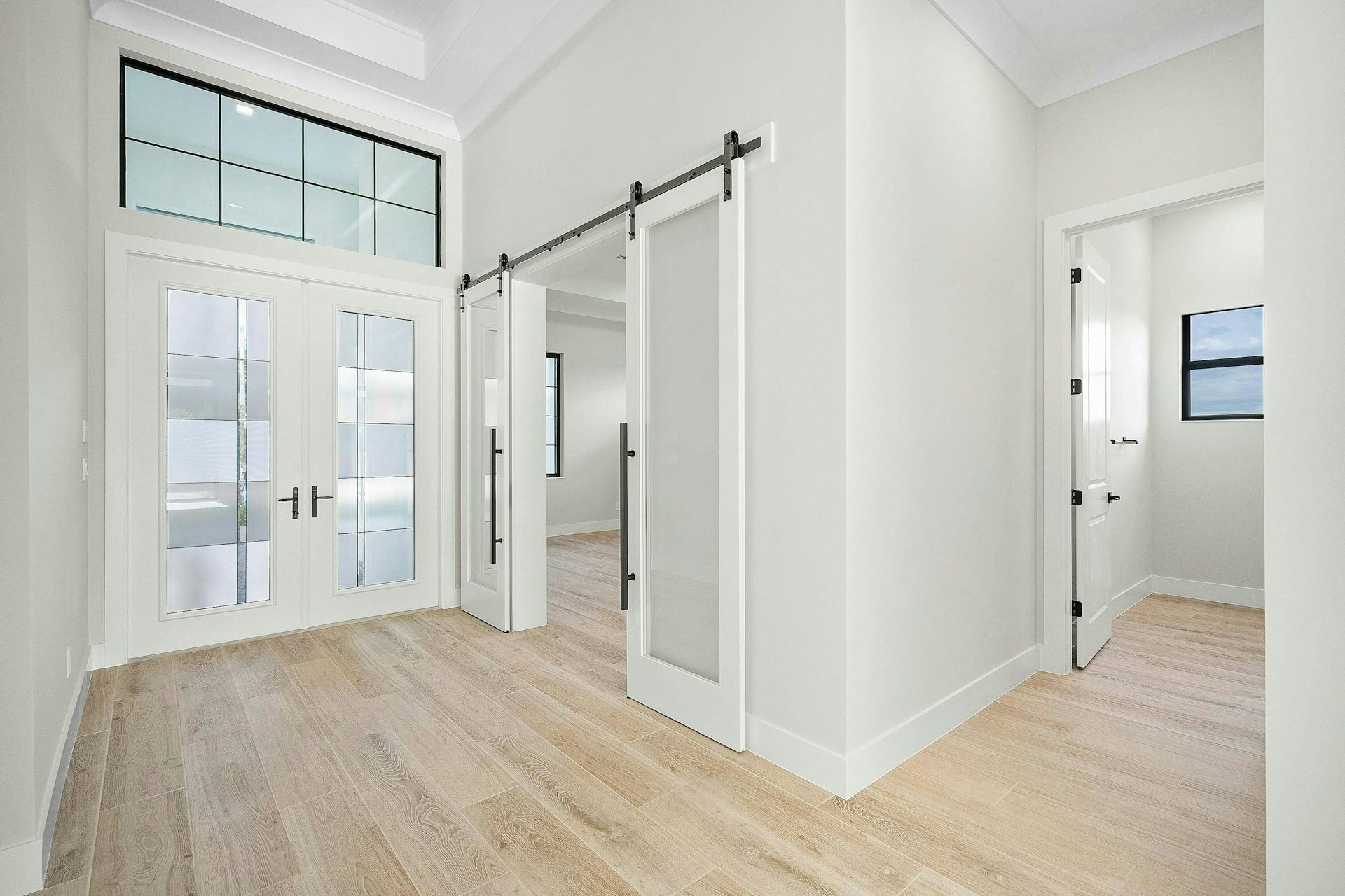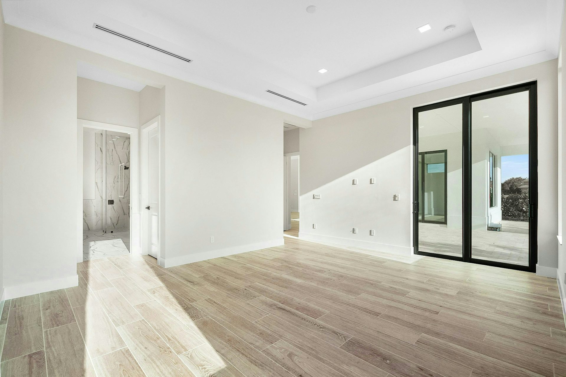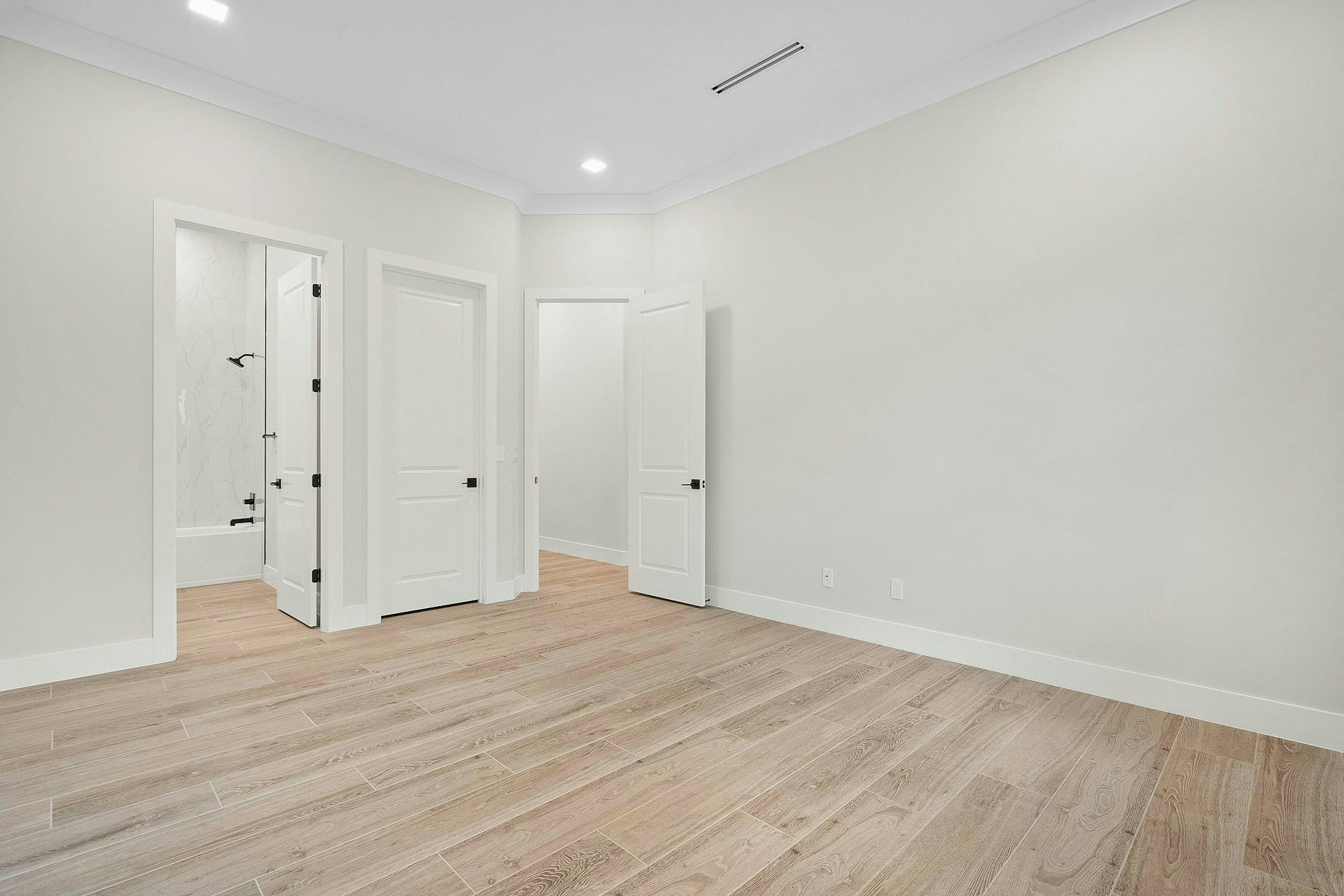 The secondary bedrooms are located at the front of the home, each offering walk-in closets and private baths.