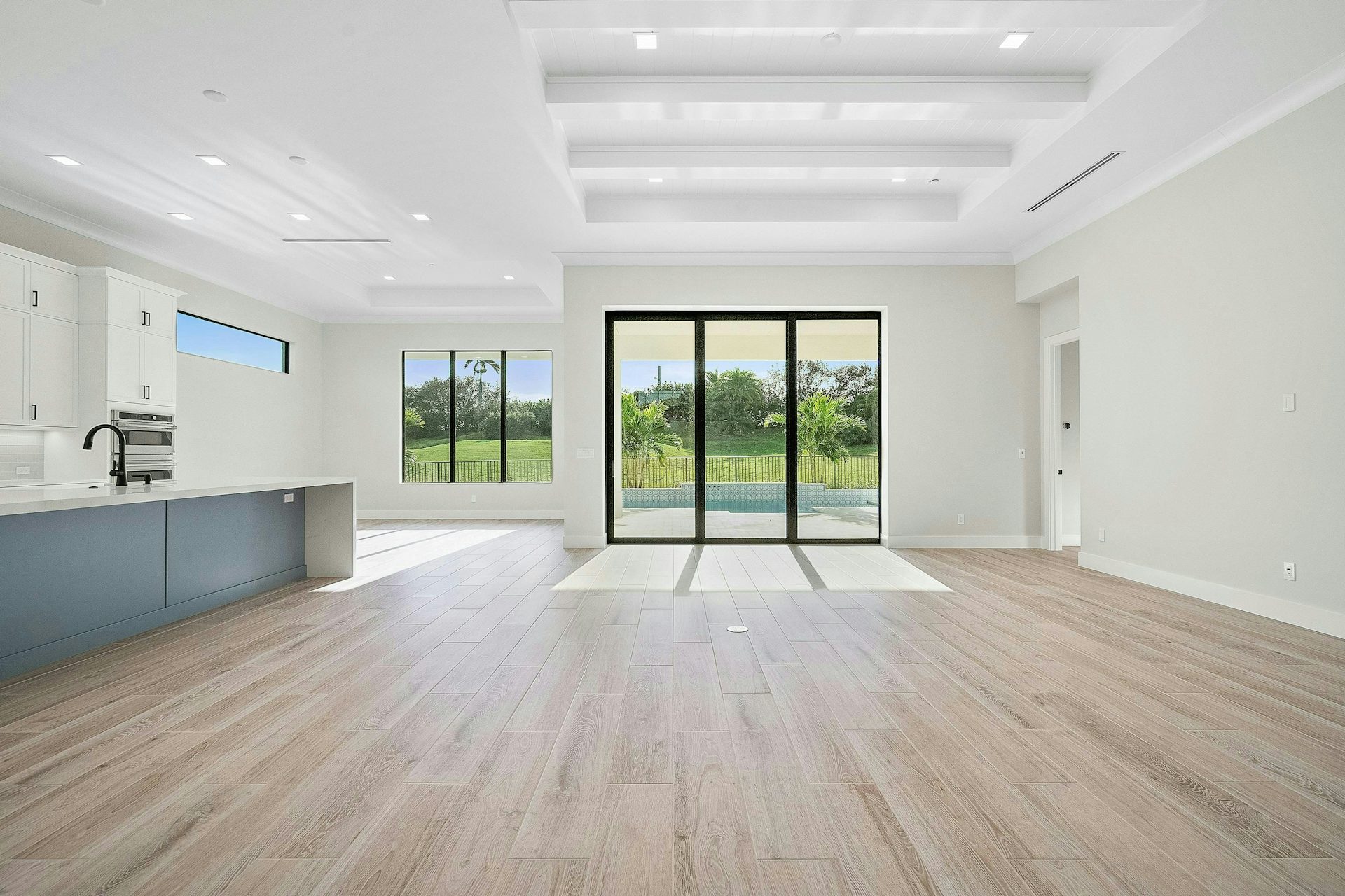 The gourmet island kitchen is equipped with quartz countertops, a stainless-steel appliance package with 42” refrigerator and 36” natural gas cooktop plus a walk-in pantry. The adjacent great room with coffered ceiling and a bar area offers a comfortable space for relaxation and social gatherings, while the dining area is perfect for family meals and morning coffee. Step through the 10-foot sliding door onto the covered patio to enjoy Florida living.