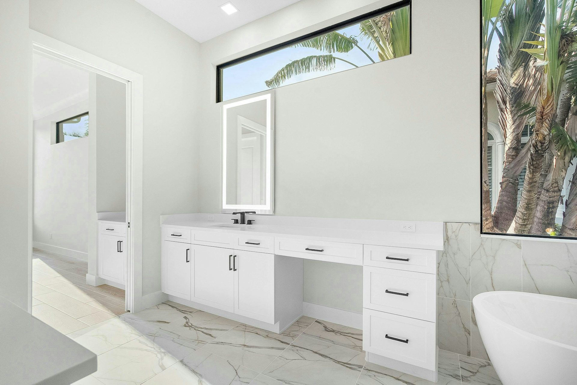 The master suite offers a luxurious retreat with large windows and a slider to the lanai. In the master bath split vanities, generous walk-in closets, a spacious shower, and a free-standing soaker tub provide a spa like feel.
