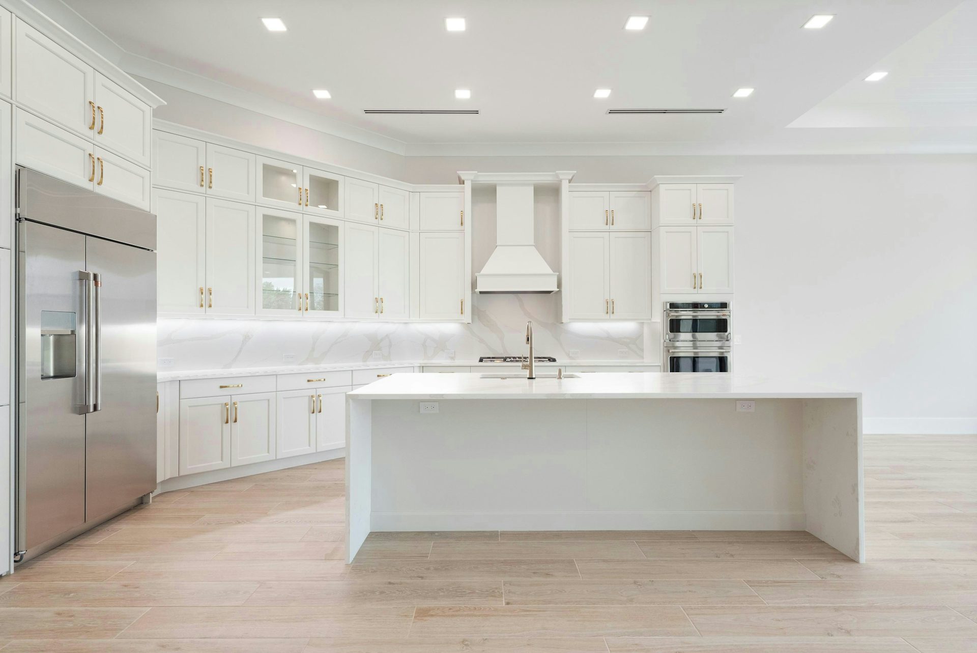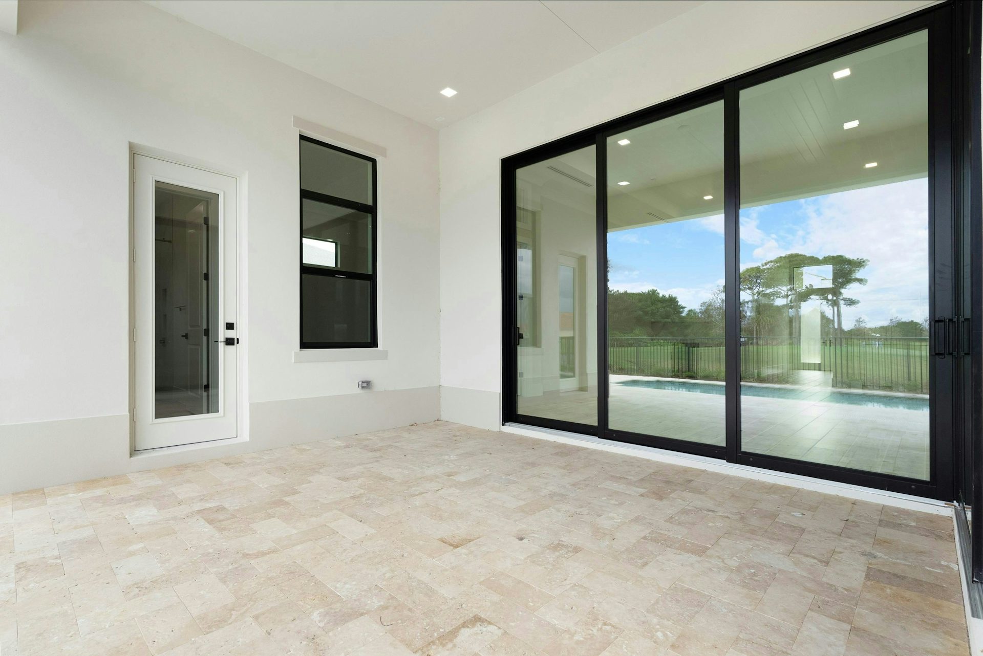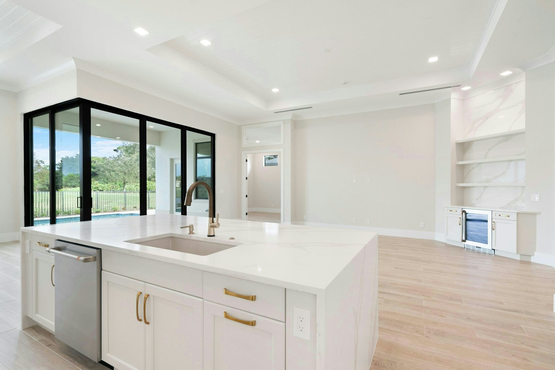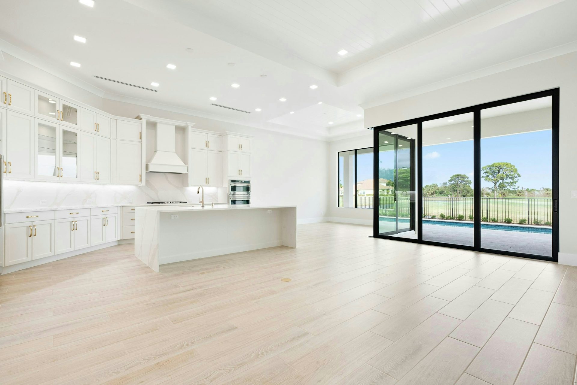 The kitchen boasts a large counter-height island, elegant quartz countertops, high-end appliances, and a spacious walk-in pantry. The dining area, adorned with large windows and a tray ceiling, enhances the home’s sophisticated and inviting atmosphere. Adjacent to these areas is a club room perfect for a game room or art studio, and just beyond the great room, a lanai welcomes outdoor entertaining.