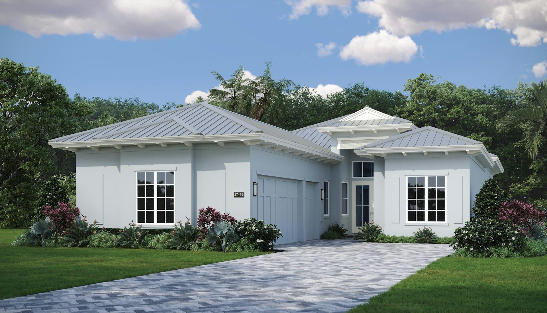 The Stella plan offers 3 bedrooms, 3 bath, a 2+ car garage. With expansive windows and large slider natural light creates a bright, welcoming atmosphere. The open-concept layout seamlessly connects the kitchen, great room, and dining area, providing easy access to the lanai for effortless indoor and outdoor entertaining.
