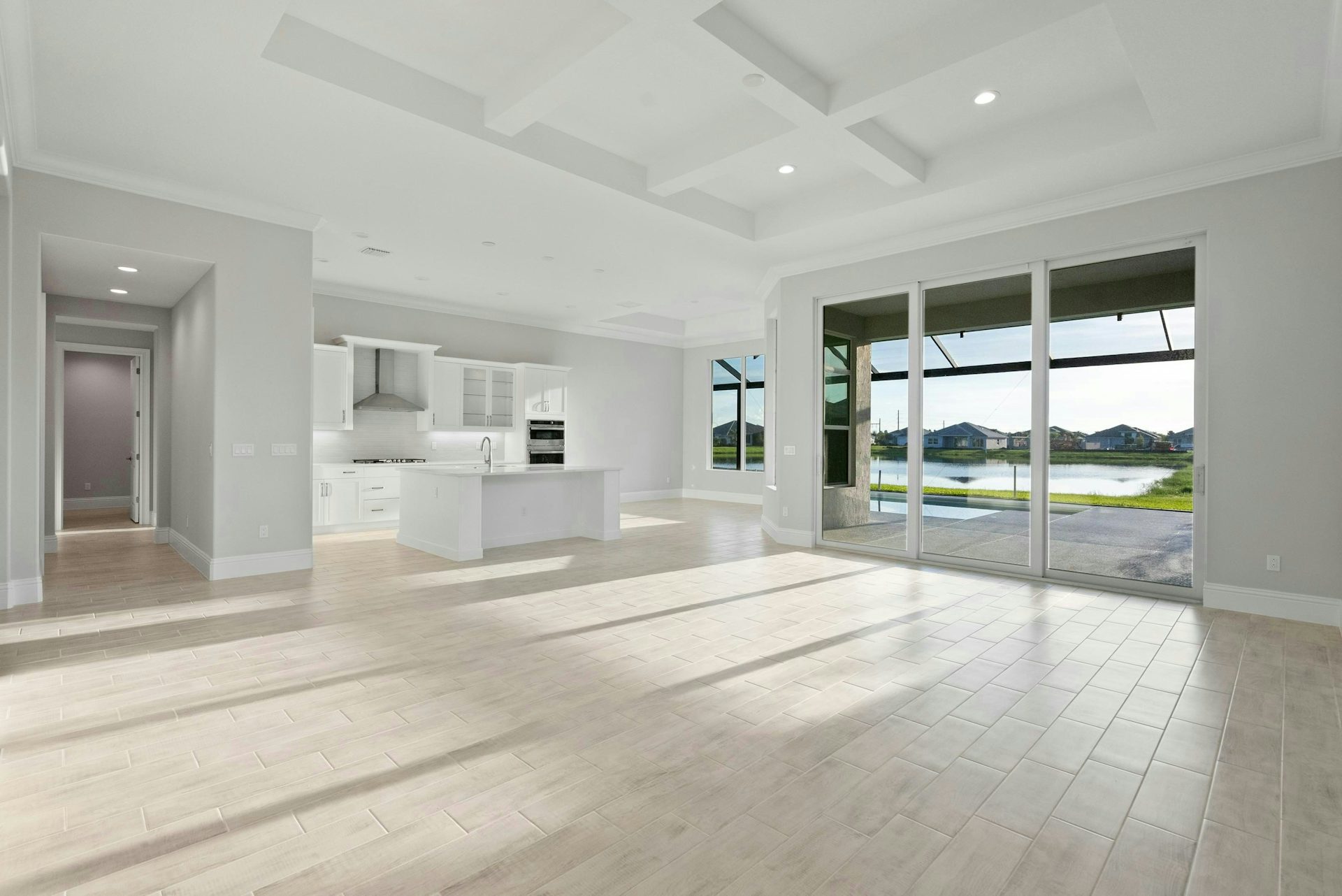 The Monarch Grande floor plan is a spacious residence offering 3 bedrooms, 2.5 bath, den and 3-car garage. The home features an open-concept layout, with a large great room that seamlessly connects to the gourmet kitchen, equipped with high-end appliances, oversized counter height island and quartz counter tops. The great room is accented with transom windows and a large slider with a coffered ceiling soaring to 12’4”. A dining area off the side of the kitchen is illuminated with large windows.