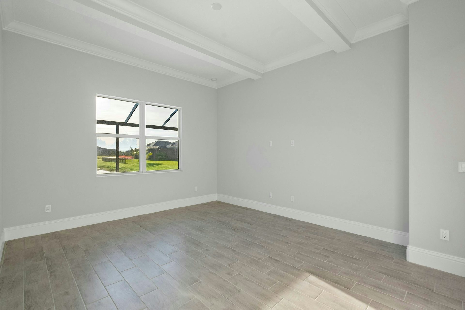 The master suite is a luxurious retreat, complete with two walk-in closets and a spa-like bathroom with dual vanities and walk-in shower. Secondary bedrooms are generously sized, providing plenty of room for family members or guests. A den at the rear of the home is ideal for a home office, media or fitness room.
