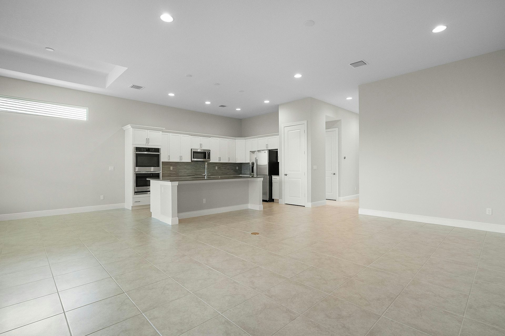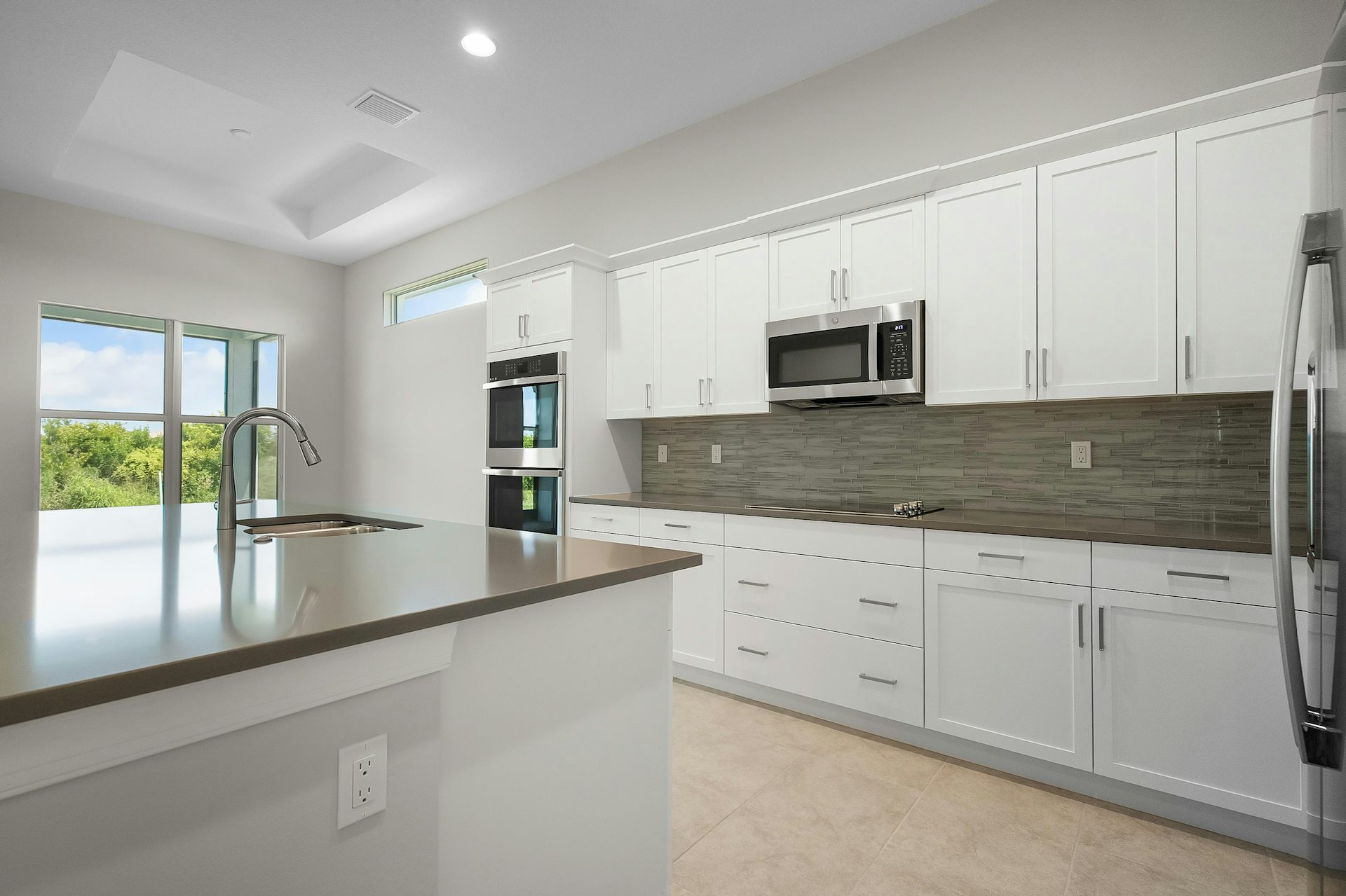 This welcoming 2 bedroom, 2 bath plus den home provides soothing colors indoors and out. The Island elevation with 4' garage extension is accented with blue and white tones. The interior is inviting with white and grey tones in the kitchen with upgraded tile backsplash, glass cooktop and double wall oven, plus 3 jboxes above the kitchen island for future pendant lights. The laundry room is finished with upper and lower cabinets including a drop-in laundry tub. The office is accented with double single-lite glass French doors. Pocket door at master bath water closet. Tile flooring throughout the home plus a floor outlet and 4 hi hats in great room. The lanai is finished with an exterior wall mount TV package.